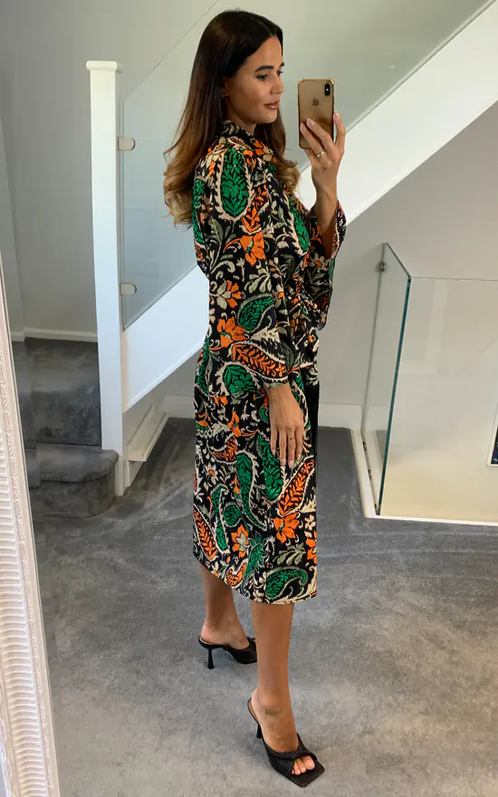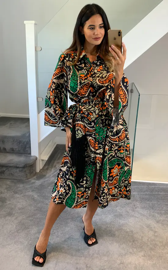 This vibrant print shirt dress is adorned with buttons running down the full length. Trumpet sleeves and pointed collar detail. A wonderful black fringed sash belt to gives added wow. 100% polyester. Machine wash 30c.