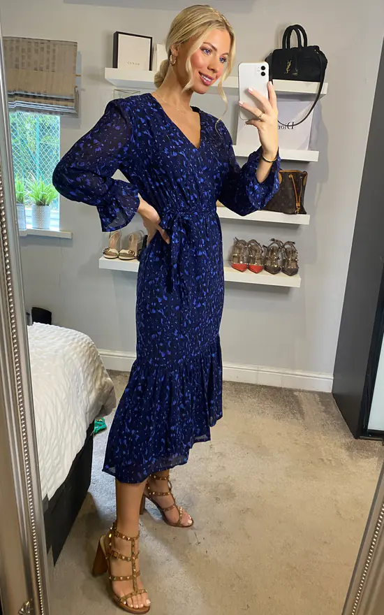 Subtle animal print, meets not-so-subtle sass. This midi dress comes in a stunning blue print and features a flattering v-neck, cuffed long sleeves and a gypsy style frilled skirt. Match with strappy black platforms to complete the look.