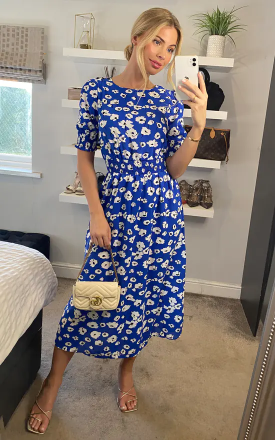 Show off your style in this Yumi Blue Daisy Midi Dress. This gorgeous floral print will make great addition to your wardrobe. This dress is Accented with ruched detailing, elasticated 1/4 length sleeves. Perfect matched with statement strappy sandals and a cropped denim jacket.