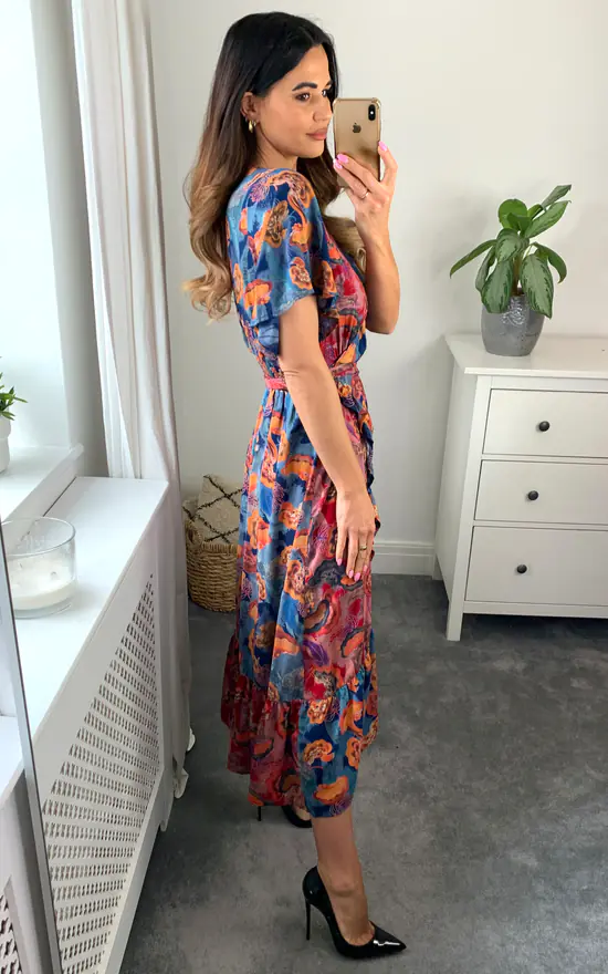 Dual print viscose wrap dress with flounce hem. Maxi or midi length depending of your height.